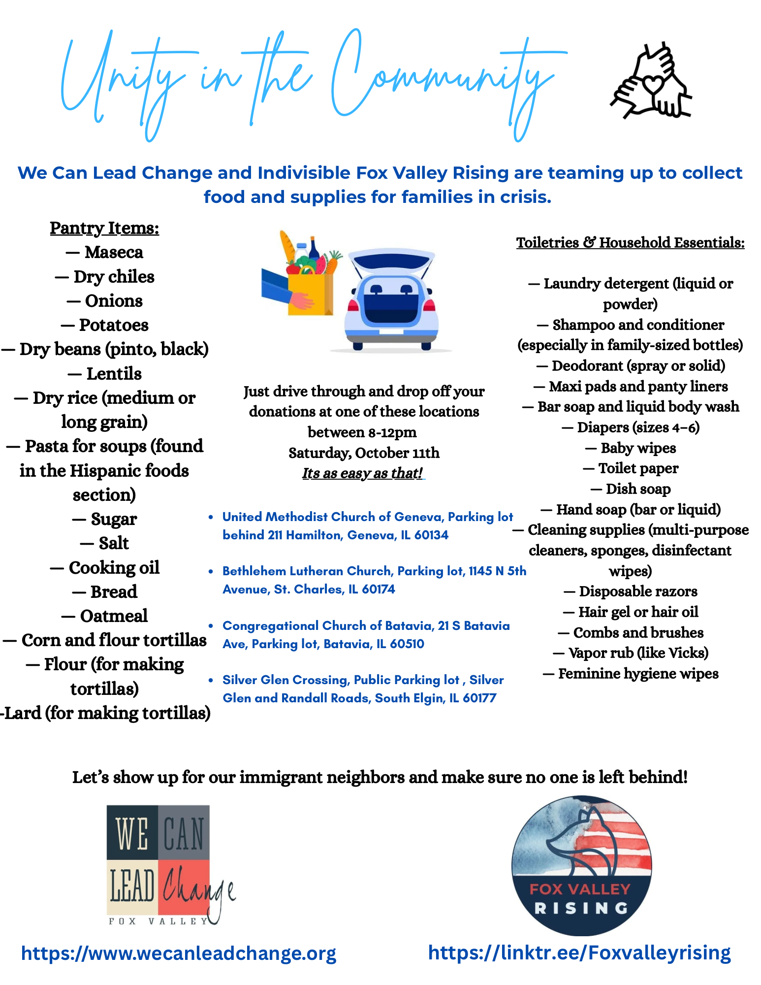 We Can Lead Change and Indivisible Fox Valley Rising are teaming up to collect food and supplies for families in crisis.